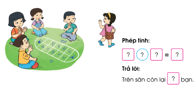 b) Lúc đầu trên sân có 5 bạn đang chơi, sau đó 1 bạn đi về. Hỏi trên sân còn lại mấy bạn?
