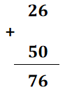 - 6 cộng 0 bằng 6, viết 6 - 2 cộng 5 bằng 7, viết 7 Vậy 26 + 50 = 76. |