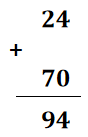 - 4 cộng 0 bằng 4, viết 4 - 2 cộng 7 bằng 9, viết 9 Vậy 24 + 70 = 94. |