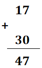 - 7 cộng 0 bằng 7, viết 7 - 1 cộng 3 bằng 4, viết 4 Vậy 17 + 30 = 47. |