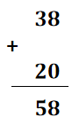 - 8 cộng 0 bằng 8, viết 8 - 3 cộng 2 bằng 5, viết 5 Vậy 38 + 20 = 58. |