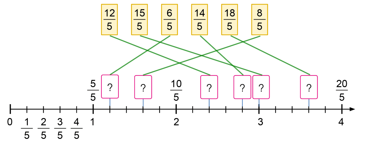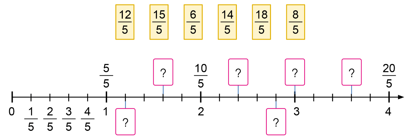 Xếp các thẻ ghi phân số vào vị trí thích hợp trên tia số: