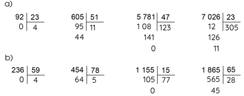 Quan sát thương của phép chia đầu tiên, rồi tìm kết quả của mỗi phép tính trong từng cột: