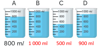 Số thứ nhất là 800 ml, số thứ hai là 1 000 ml, số thứ ba là 500 ml, số thứ tư là 900 ml.