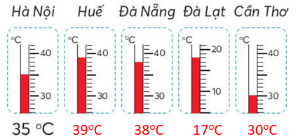 Số thứ nhất là 35oC, số thứ hai là 39oC, số thứ ba là 38oC, số thứ tư là 17oC, số thứ năm là 30oC.