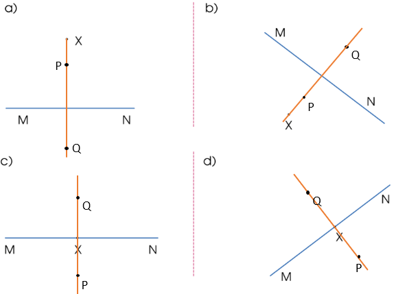 Vẽ đường thẳng PQ đi qua điểm X và vuông góc với đường thẳng MN trong các trường hợp sau đây: