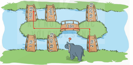 Có 7 cây cầu như hình vẽ. Biết voi coi cân nặng 150 kg. Voi con không được đi qua cây cầu ghi số đo bé hơn cân nặng của nó. Hỏi voi con phải đi qua những cây cầu nào để đi từ bờ bên này sang bờ bên kia?