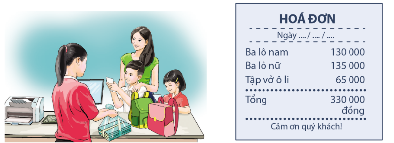Hai anh em Hoàng Đức và Phương Dung đi cùng mẹ vào siêu thị. Khi tính tiền, cô bán hàng đưa hóa đơn ghi như dưới đây.