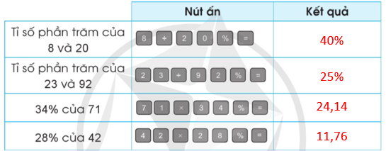 b) Dùng máy tính cầm tay để tìm tỉ số phần trăm của hai số sau (nếu phần thập phân của kết quả có nhiều chữ số thì chỉ lấy đến 2 chữ số):