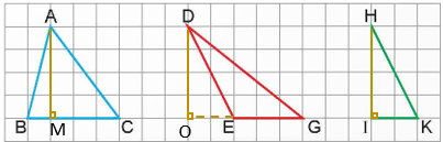 Học sinh vẽ các đường cao AM, DO, HI lần lượt cho 3 hình tam giác.