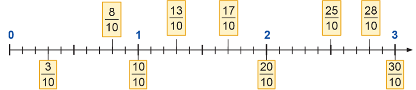 c) Xếp các thẻ ghi phân số thập phân vào vị trí thích hợp trên tia số: