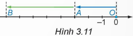 Di chuyển tiếp sang trái thêm 5 đơn vị đến điểm B (H.3.11). B chính là điểm biểu diễn kết quả của phép cộng (– 3) + (– 5). Điểm B biểu diễn số nào? Từ đó suy ra giá trị của tổng (– 3) + (– 5).