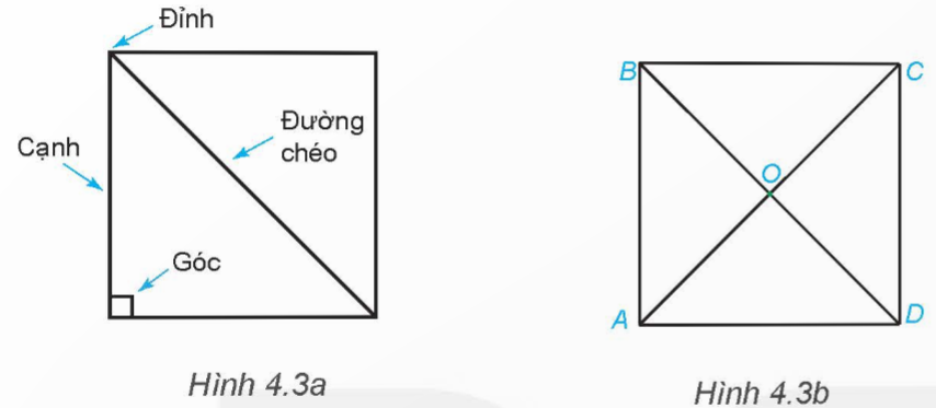 1. Nêu tên các đỉnh, cạnh, đường chéo của hình vuông ABCD (H.4.3b)