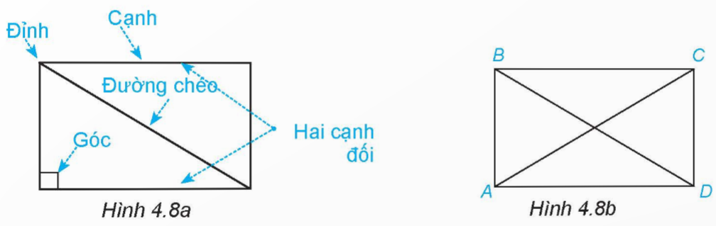 1. Nêu tên đỉnh, cạnh, đường chéo, hai cạnh đối của hình chữ nhật ABCD (H.4.8b)