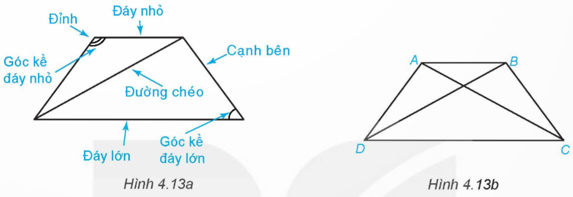 1. Gọi tên các đỉnh, đáy lớn, đáy nhỏ, đường chéo, cạnh bên của hình thang cân ABCD (H.4.13b).