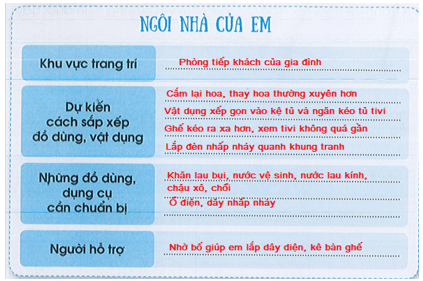 Vở bài tập HĐTN lớp 3 trang 24 Hoạt động 3: Sau khi cùng người thân thực hiện trang trí ngôi nhà, em hãy ghi lại kết quả vào bảng dưới đây: