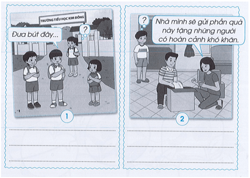 + Trong tình huống của bức tranh 2: Hoạt động này ý nghĩa quá! Tớ rất thích thú. Các bạn có thể cho tớ cùng tham gia góp quà tặng những người có hoàn cảnh khó khăn được không?