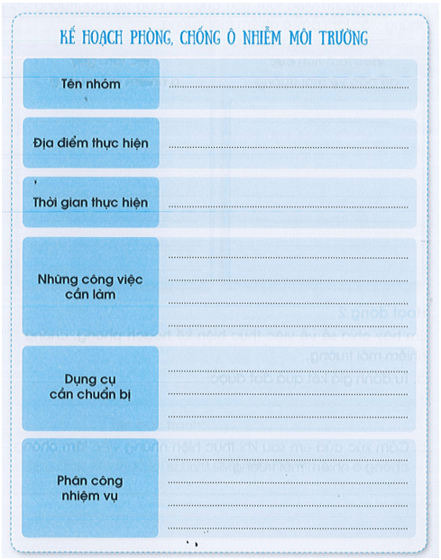 Vở bài tập HĐTN lớp 3 trang 51 Hoạt động 3: Xây dựng kế hoạch phòng, chống ô nhiễm môi trường theo gợi ý dưới đây: