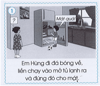 - Ở bức tranh số 1, em sẽ xử lí bằng cách nói với em Hùng rằng: tủ lạnh dùng điện để làm mát tủ. Nếu em làm vậy sẽ gây tốn điện rất nhiều. Có thể bật quạt và ngồi một chút sẽ mát và tiết kiệm hơn đó.