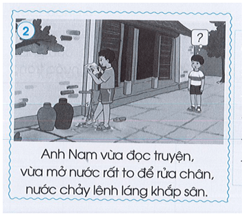 - Ở bức tranh số 2, em sẽ xử lí bằng cách nói với anh Nam: anh cần tiết kiệm nước, rửa chân cần tập trung và đọc sách cũng cần tập trung. Hãy làm một việc trước để không bị quên và lãng phí nước như vậy!