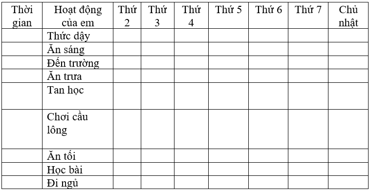 - Bước 3: Điền thời gian thực hiện tương ứng với mỗi hoạt động trong ngày của em vào cột “Thời gian” trong bảng Thời gian biểu bên dưới.