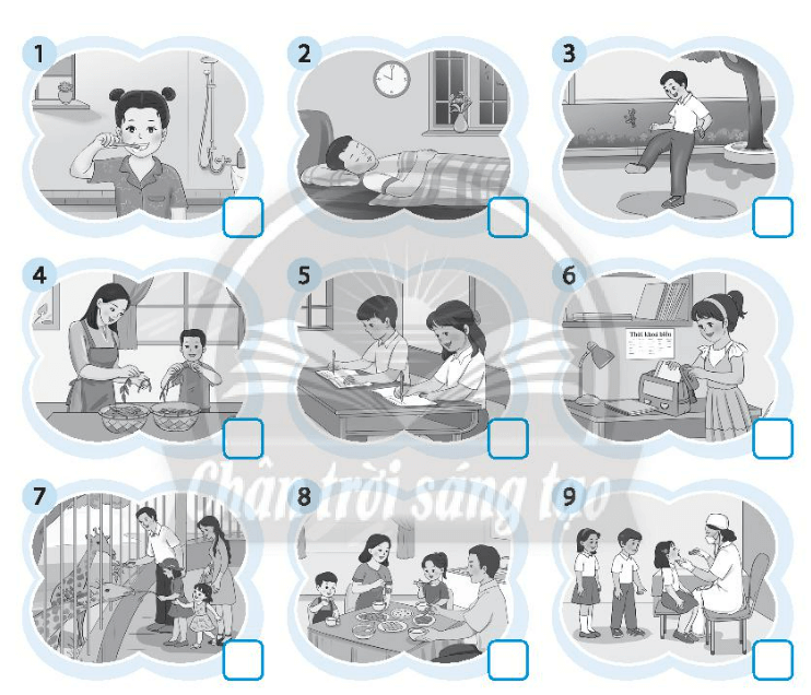 Vở bài tập HĐTN lớp 3 trang 5 Nhiệm vụ 1: Quan sát tranh và đánh dấu X vào ô trống dưới những hoạt động thường diễn ra trong ngày.