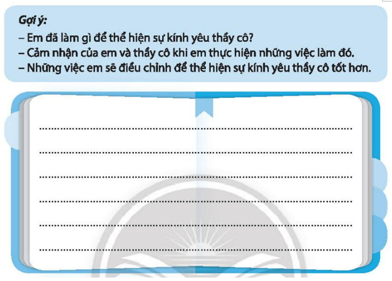 Vở bài tập HĐTN lớp 3 trang 19 Nhiệm vụ 4: Viết cảm nhận và suy nghĩ của em khi thực hiện những việc làm thể hiện sự kính yêu thầy cô.