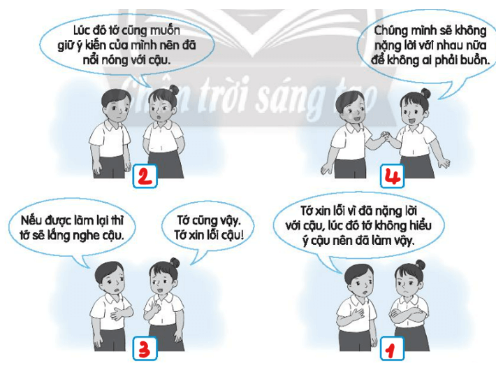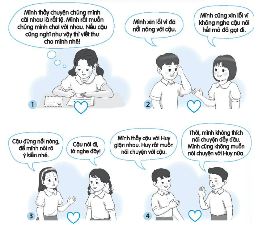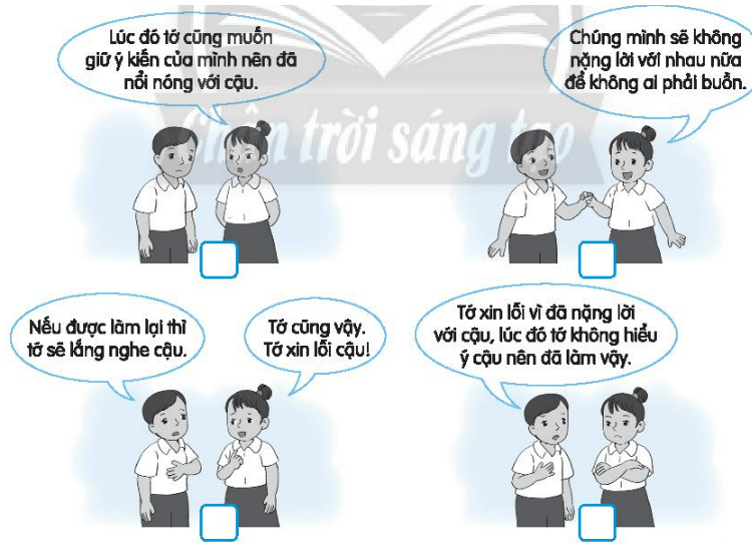 Vở bài tập HĐTN lớp 3 trang 21 Nhiệm vụ 6: Viết các số từ 1 đến 4 vào ô trống dưới tranh để sắp xếp thứ tự các bước hòa giải bất đồng với bạn bè.