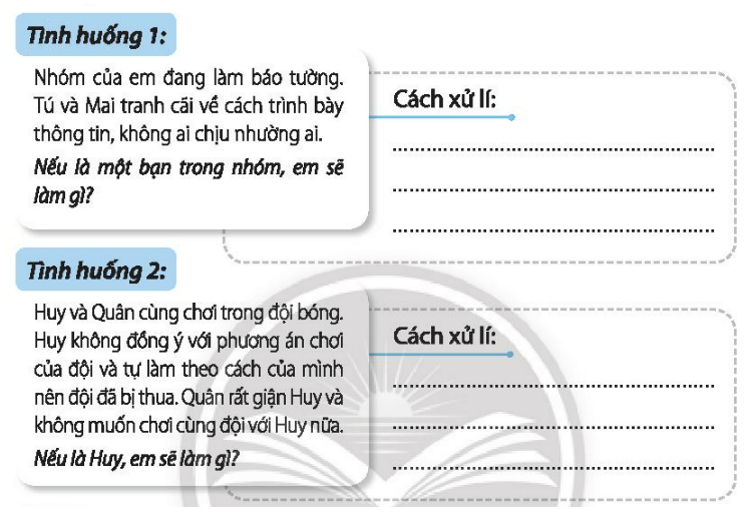 - Tình huống 1: Cách xử lí: Nếu em là một bạn trong nhóm, em sẽ khuyên hai bạn bình tĩnh trình bày ý tưởng của mình và để các bạn trong nhóm biểu quyết để lựa chọn, bạn nào có nhiều phiếu ủng hộ hơn thì sẽ trình bày theo cách của bạn đó.