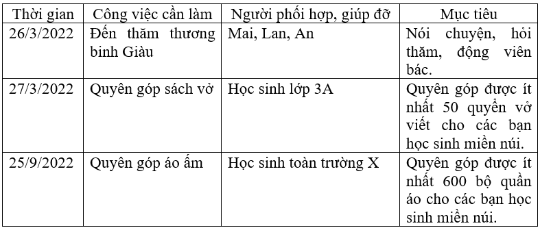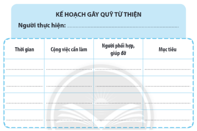 Vở bài tập HĐTN lớp 3 trang 28 Nhiệm vụ 5: Trình bày kế hoạch gây quỹ hoạt động tình nguyện, nhân đạo của em vào mẫu sau: