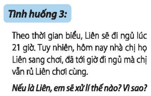 → Cách xử lí: Nếu là Liên, em sẽ nói với chị rằng đến giờ em đi ngủ rồi, hẹn chị ngày mai mình đi chơi với nhau.