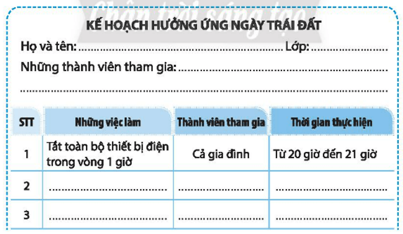 1. Em hãy lập kế hoạch thực hiện những việc làm để hưởng ứng Ngày Trái Đất bằng cách điền vào bảng sau: