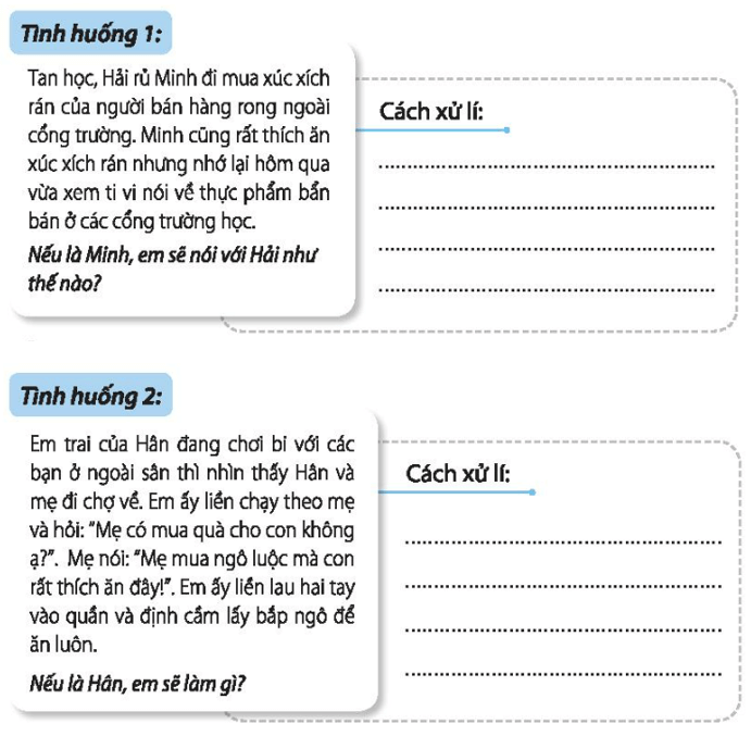 - Tình huống 1: Cách xử lí: Nếu là Minh, em sẽ nói với Hải không nên ăn xúc xích rán ngoài cổng trường và kể cho Hải nghe về bản tin nói về thực phẩm bẩn bán ở cổng trường hôm qua mình xem được.