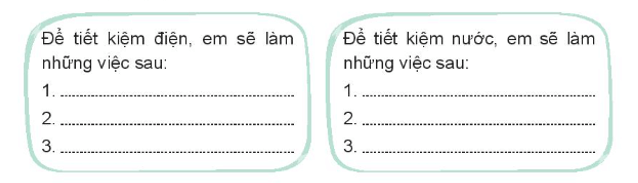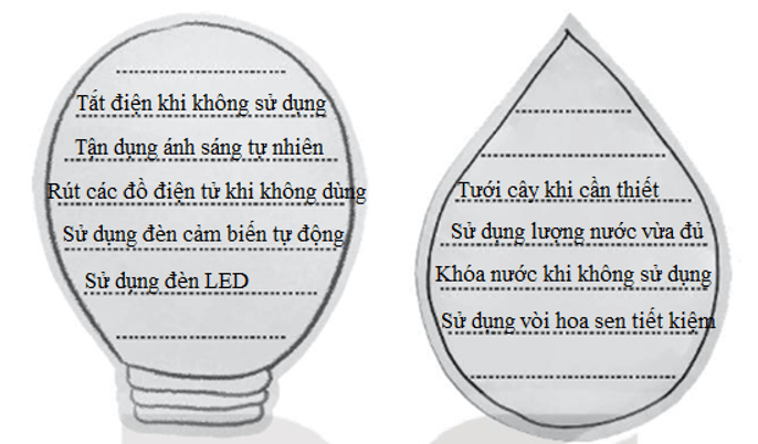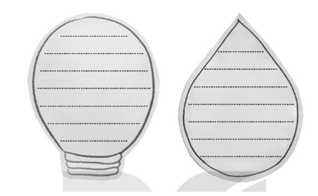 Em hãy cắt tấm bìa hình bóng đèn và hình giọt nước, sau đó ghi những việc em sẽ làm để tiết kiệm điện nước theo mẫu sau: