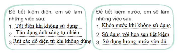Trong mấy ngày tới, em dự định sẽ thực hiện những việc làm sau để tiết kiệm điện, nước: