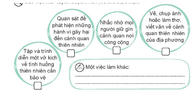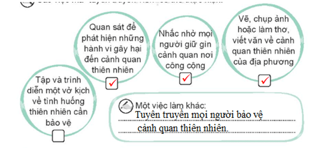 – Chia sẻ cùng người thân về bản Quy tắc ứng xử để bảo vệ cảnh quan thiên nhiên mà em và các bạn đã xây dựng và thống nhất.