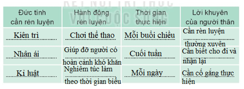 − Kế hoạch rèn luyện đức tính phù hợp với nghề em yêu thích mà em đã thảo luận và lập cùng các bạn