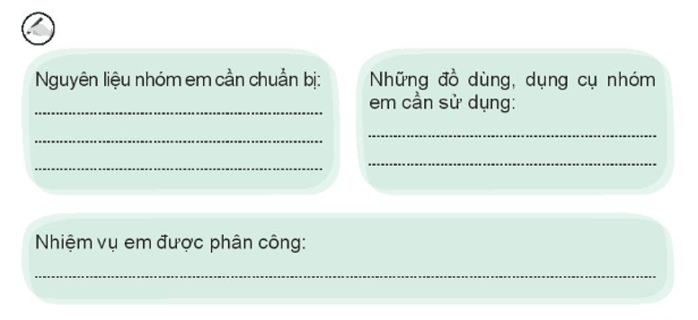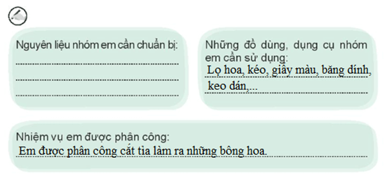 − Những nguyên vật liệu, đồ dùng, dụng cụ cần dùng cho hoạt động chung của nhóm em.