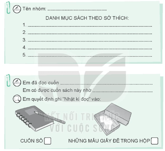 − Làm “Nhật kí đọc” bằng cách chuẩn bị một cuốn sổ hoặc một chiếc hộp cất giữ các mẩu giấy ghi thông tin những cuốn sách em đã đọc.