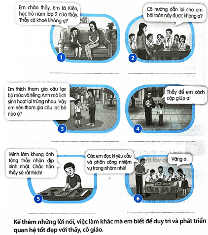 Nhiệm vụ 1: Viết những việc làm để duy trì và phát triển quan hệ tốt đẹp với thầy, cô giáo vào chỗ trống dưới mỗi tranh