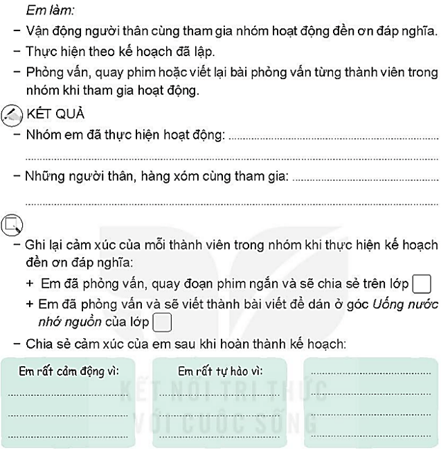 - Ghi lại cảm xúc của mỗi thành viên trong khi nhóm thực hiện kế hoạch đền ơn đáp nghĩa: