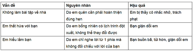 Vở bài tập HĐTN lớp 5 trang 23 Nhiệm vụ 5: Lập bảng xác định nguyên nhân và hậu quả của các vấn đề xảy ra trong quan hệ với thầy cô theo gợi ý:
