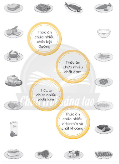 nhóm chứa nhiều chất bột đường; nhóm chứa nhiều chất đạm; nhóm chứa nhiều chất béo và nhóm chứa nhiều vi-ta-min, chất khoáng.