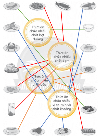 [Đ] nhóm chứa nhiều chất bột đường; nhóm chứa nhiều chất đạm; nhóm chứa nhiều chất béo và nhóm chứa nhiều vi-ta-min, chất khoáng.