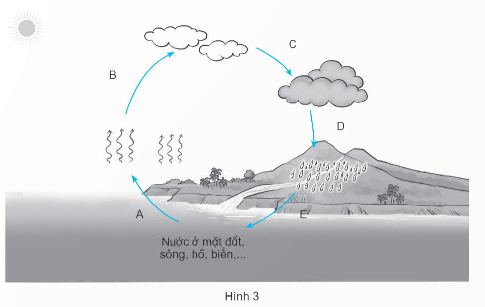 a) Sử dụng các từ/cụm từ trên điền vào các ô trống A, B, C, D, E trong hình dưới để hoàn thành sơ đồ “vòng tuần hoàn của nước trong tự nhiên”.