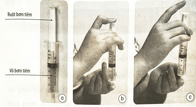 a) Khi dùng ngón tay ấn ruột bơm tiêm vào sâu trong vỏ bơm tiêm (hình b), (1)……bị (2)…… Sau đó thả tay ra (hình c), không khí lại (3)…… , đẩy ruột bơm tiêm lên trên.