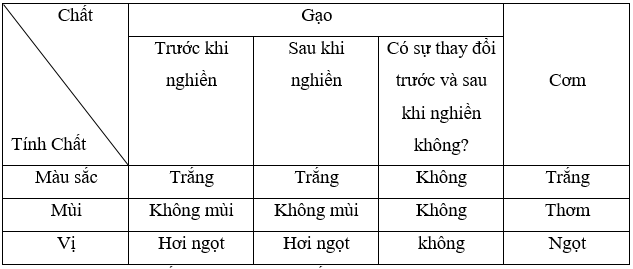 b) Gạo và cơm có màu sắc, mùi, vị không giống nhau.