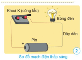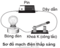 a) Trong sơ đồ mạch điện thắp sáng như hình dưới đây, hãy chỉ ra một bộ phận trên công tắc và một bộ phận trên pin dẫn điện. Giải thích vì sao các bộ phận đó cần dẫn điện.