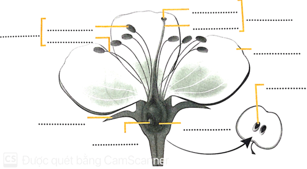 Câu 3 trang 35 VBT Khoa học lớp 5: Điền từ/ cụm từ thích hợp vào chỗ (…) trên hình để chú thích tên các bộ phận của hoa, quả; các bộ phận của nhị và nhụy.