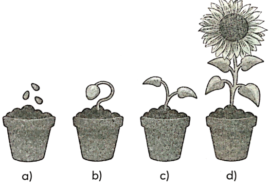 a) Viết thông tin phù hợp vào chỗ (…) để mô tả sự phát triển của cây non mọc lên từ hạt qua các hình dưới đây.
